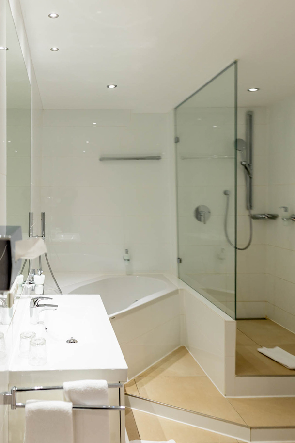 Das moderne Badezimmer, sowohl mit Dusche als auch Badewanne ausgestattet, verfügt neben dem gewohnten Komfort über ein eingebautes Radio und eine Fußbodenheizung.